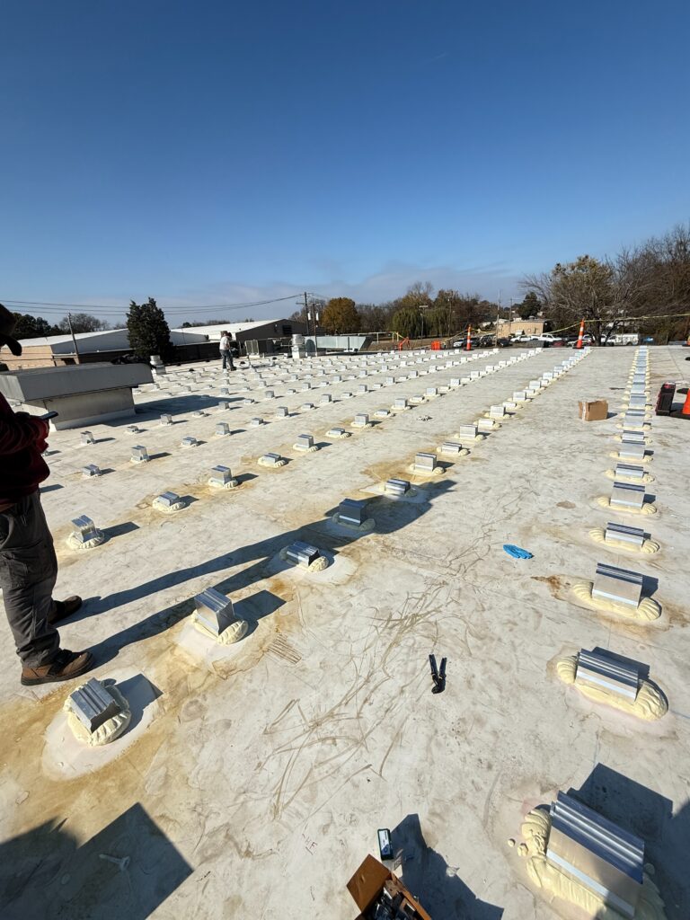 Special Consideration: Flat roof with no rain drainage required non-invasive, foam-based mounting to protect structural integrity.
